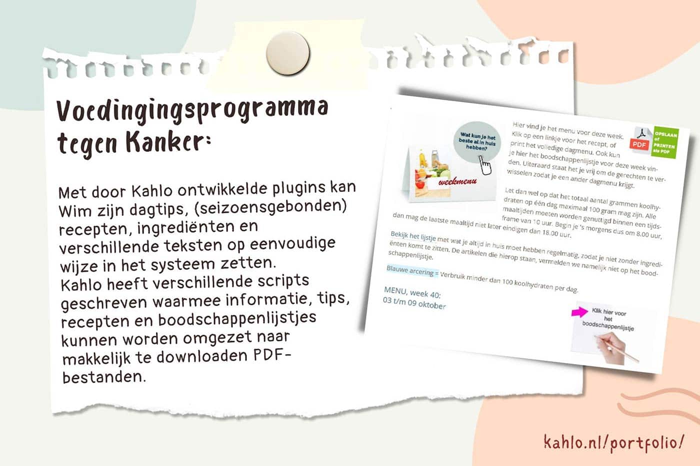 Voedingsprogramma: Met door Kahlo ontwikkelde plugins kan Wim zijn dagtips, (seizoensgebonden) recepten, ingrediënten en verschillende teksten op eenvoudige wijze in het systeem zetten. Ook heb ik verschillende scripts geschreven waarmee informatie, tips, recepten en boodschappenlijstjes kunnen worden omgezet naar makkelijk te downloaden PDF-bestanden.